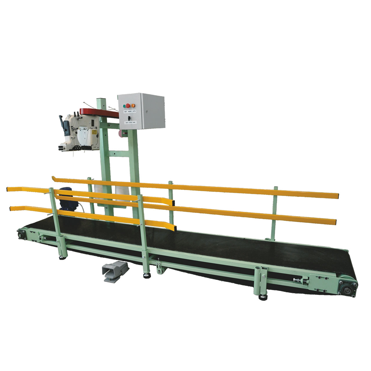 The height of the conveyor can be adjusted for sewing bags of different heights.